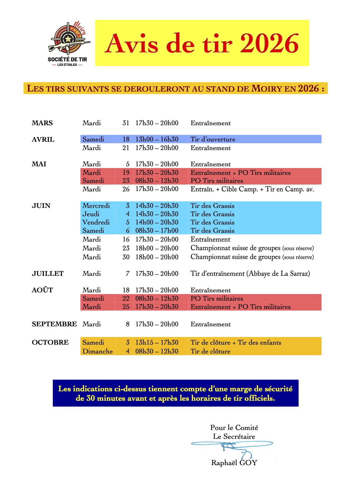 Veuillez trouver ci-dessous les dates des tirs pour l’année.